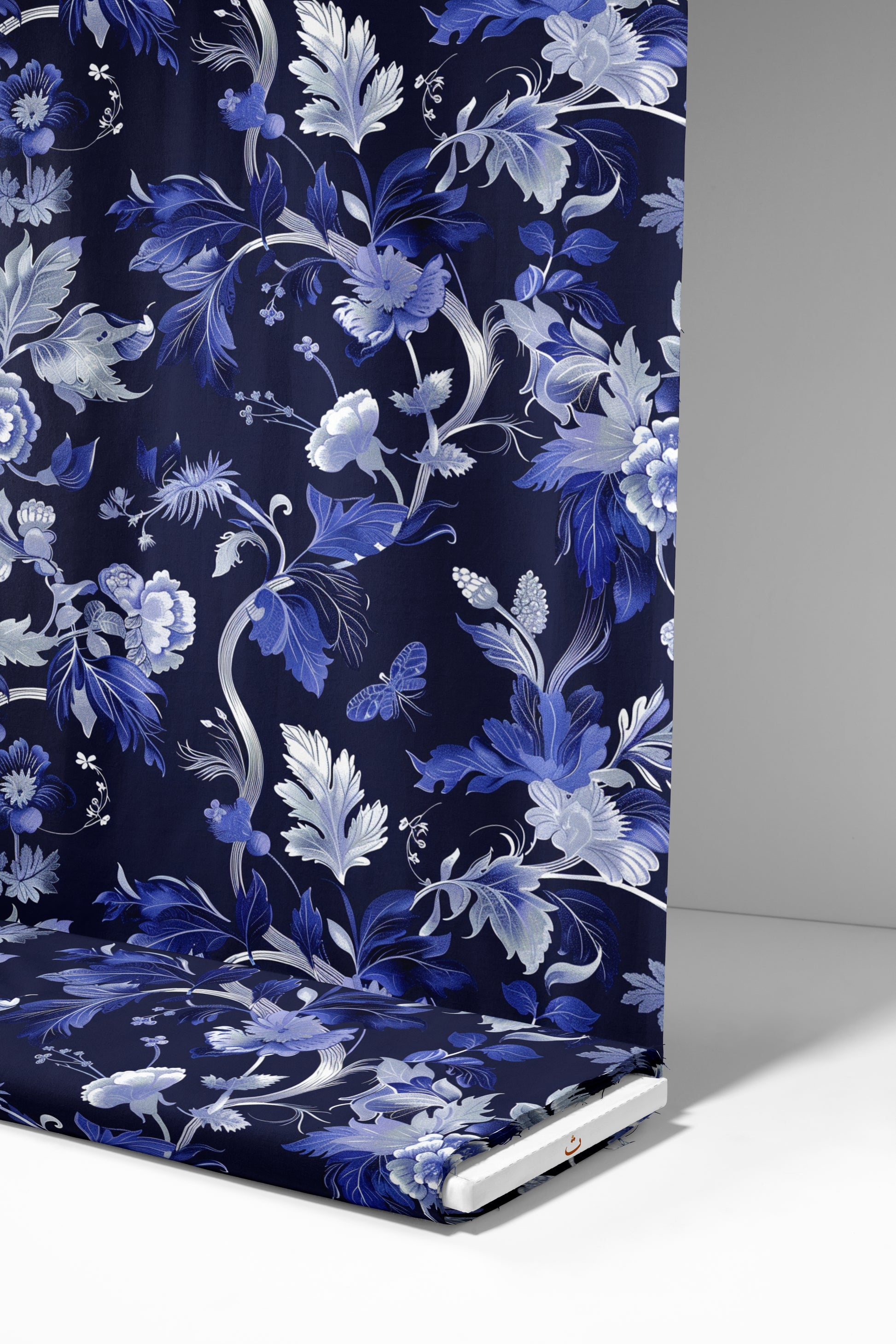 Elegant floral pattern in varying shades of blue, accented with soft whites and light silvers. The background is a deep navy blue, which allows the intricate flowers, delicate leaves, and small butterflies to stand out beautifully.