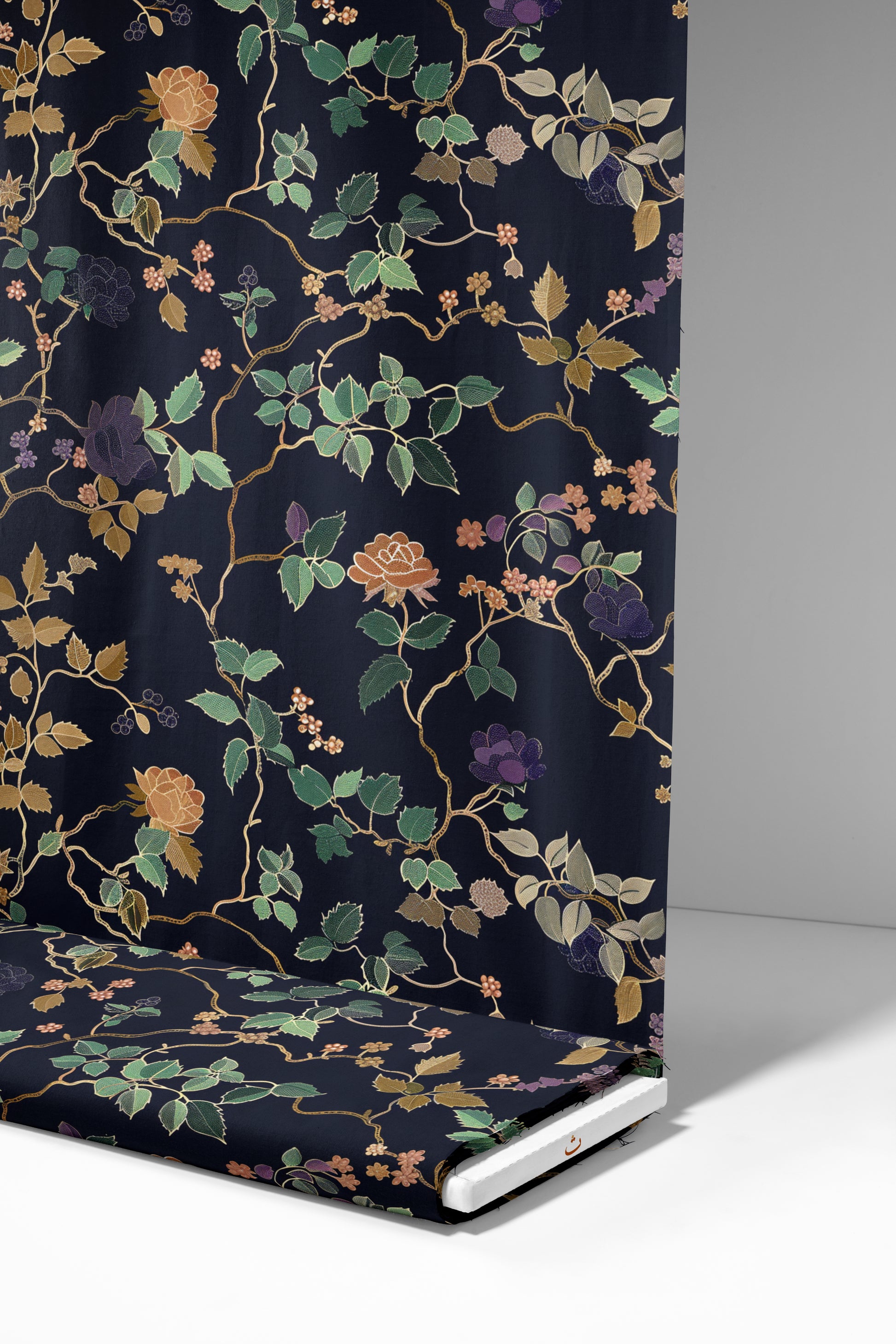Inspired by vintage botanical illustrations and traditional embroidery motifs. Set against a deep navy background, the pattern features elegant winding vines, delicate leaves, and softly hued flowers in shades of ochre, emerald, mauve, and plum. The golden vine detailing adds a subtle touch of luxury.