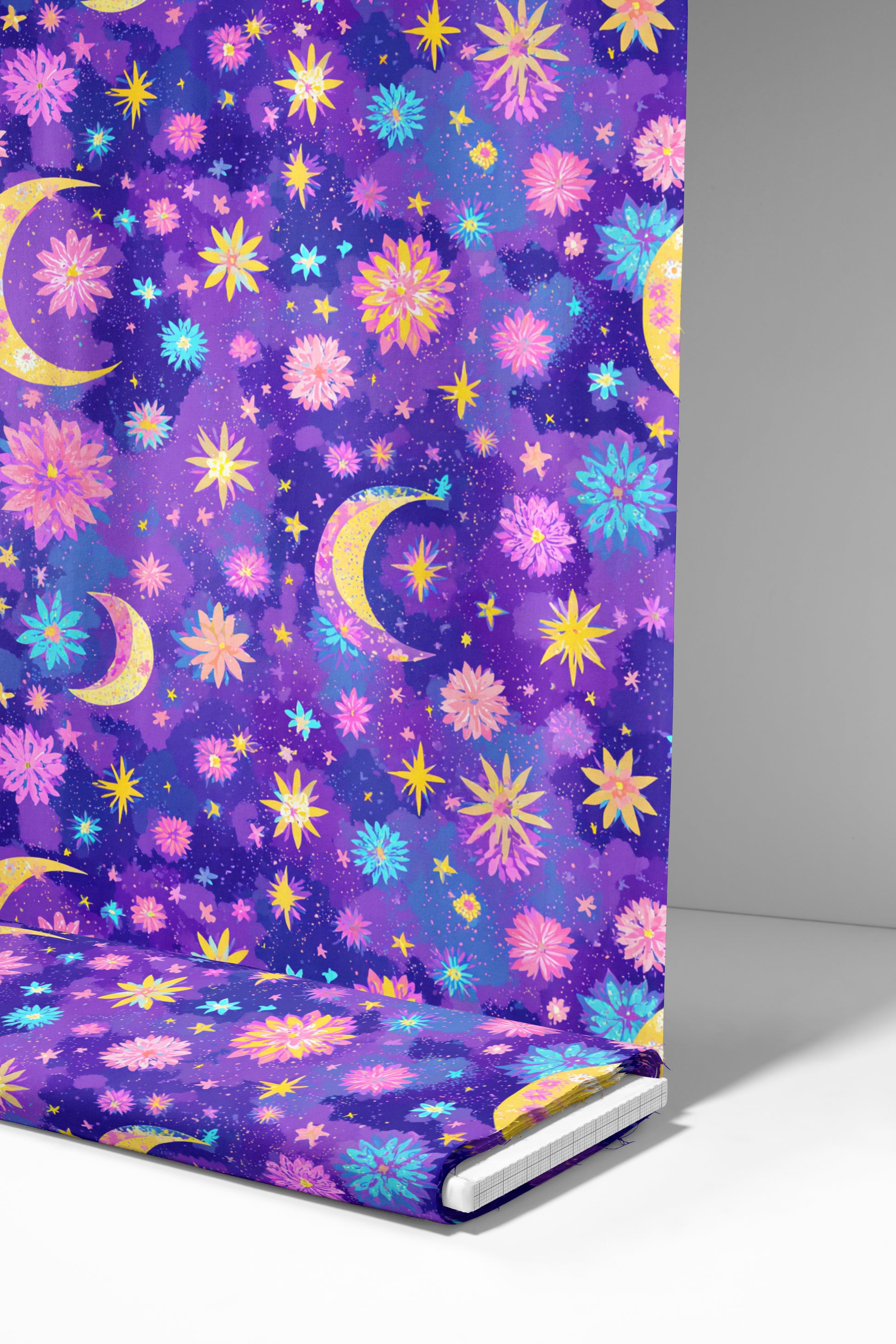 A whimsical sky bursts with glowing crescent moons, luminous stars, and blooming florals in shades of violet, pink, and turquoise. This playful and radiant pattern captures the spirit of celebration and wonder, like gazing into a magical night during a festive season.