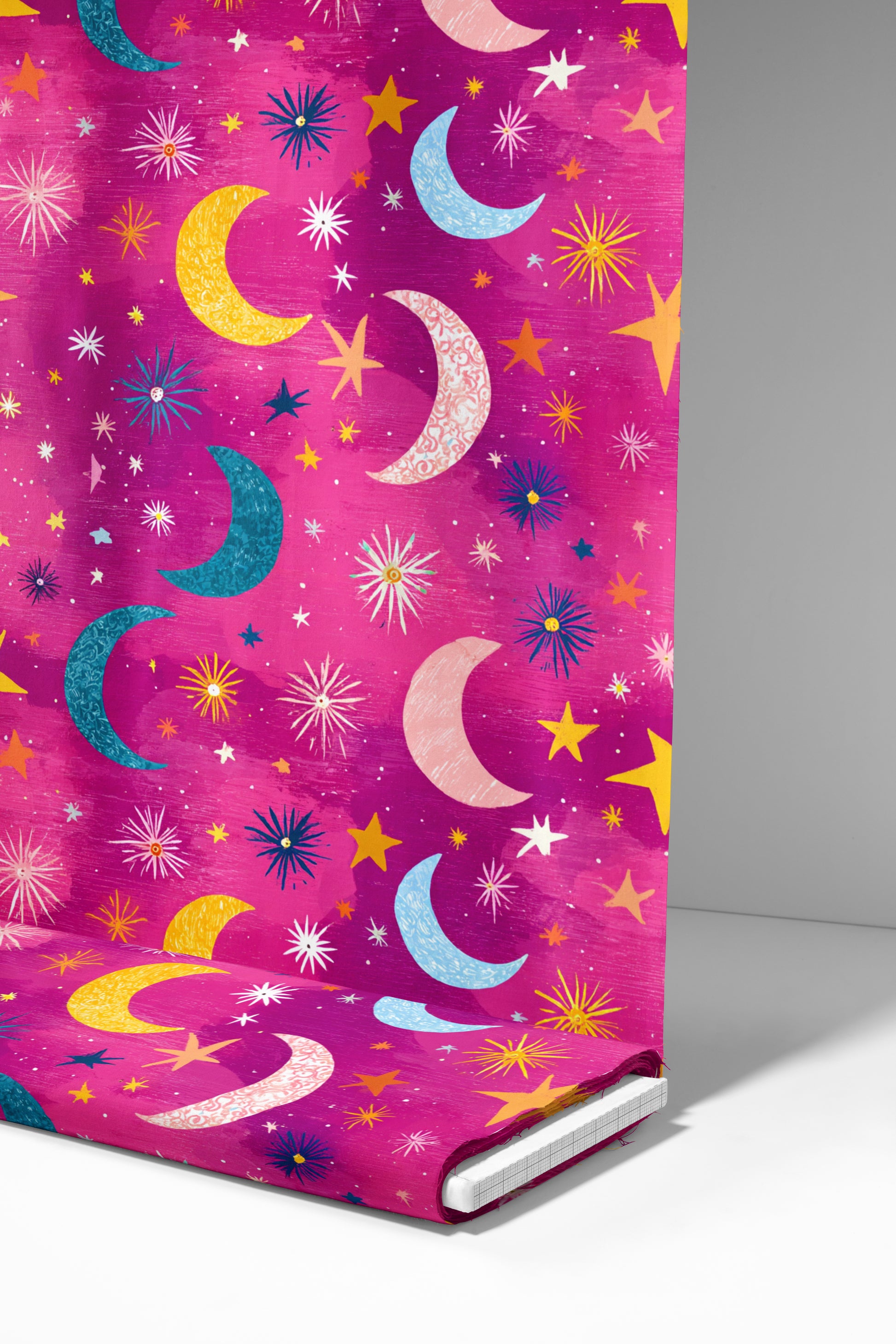 A vibrant design celebrating the spirit of Ramadan, adorned with colorful crescent moons and sparkling starbursts set against a lively pink backdrop. Playful yet sophisticated, it embodies the joy and festivity of Ramadan nights, perfect for eye-catching celebratory attire