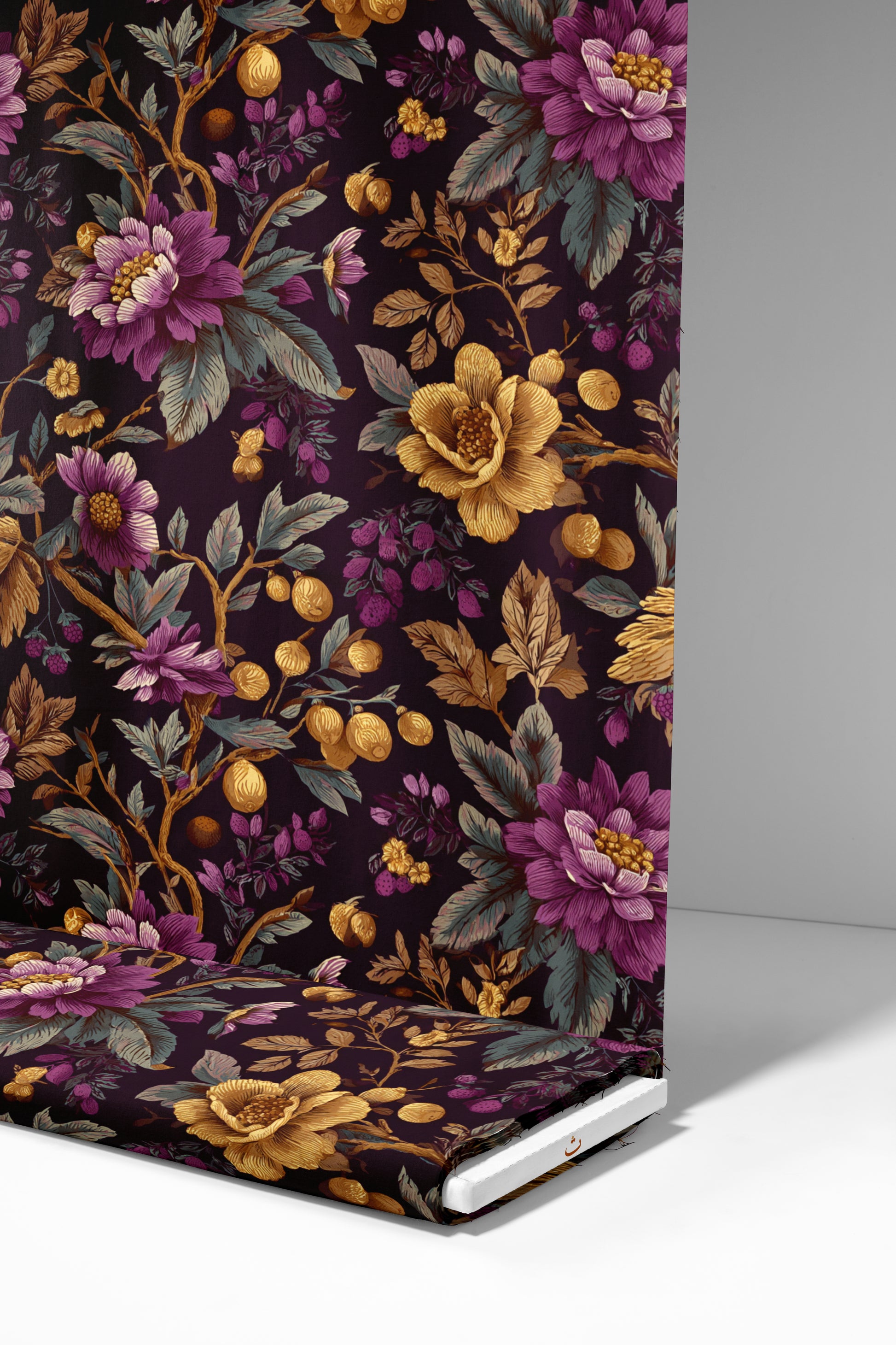 A stunning contrast of vibrant florals in pink, purple, and gold against a deep teal background, perfect for a bold and stylish outfit. This fabric adds a pop of color and energy, making it ideal for evening events or occasions that call for a little extra flair.