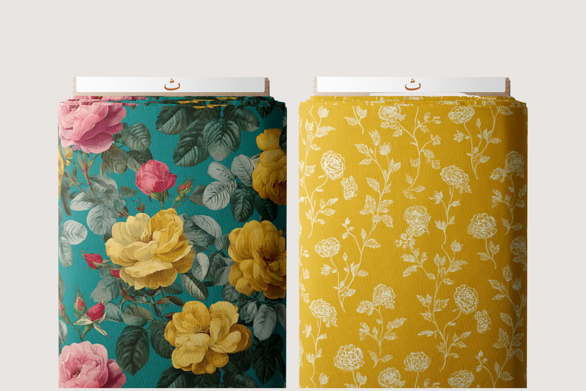 A charming duo of floral fabrics that blend bold elegance with delicate grace. Featuring rich botanical blooms on deep teal and fine ivory sketches on warm mustard, this set brings the beauty of a blooming garden into any space.