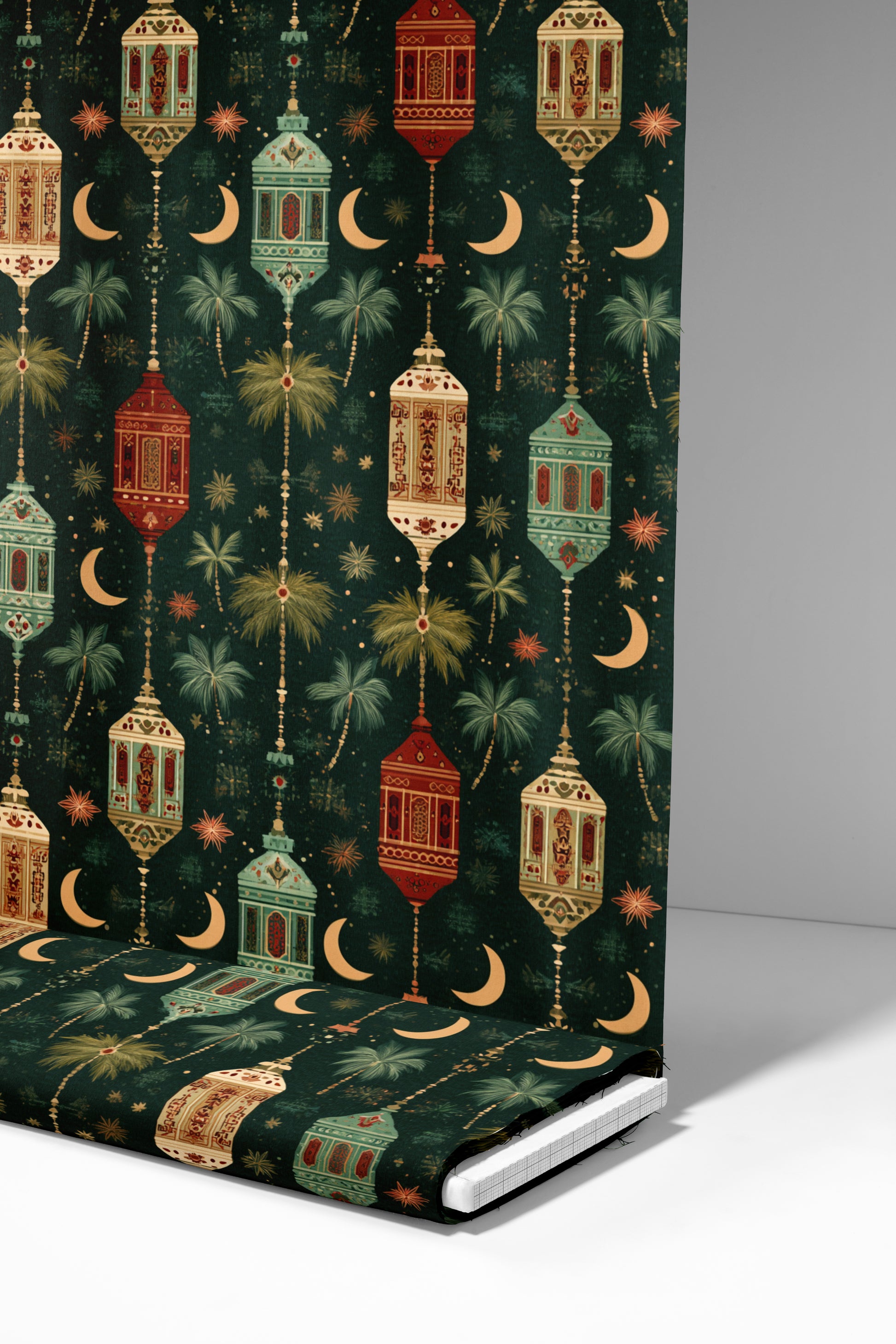This design features delicately illustrated lanterns in rich tones of crimson, gold, and turquoise, set against a deep green background. Scattered among crescent moons, palm motifs, and twinkling stars, the lanterns create a rhythmic and elegant pattern. The design captures the quiet beauty of nightfall and the warm glow of celebration, making it ideal for flowing, traditional garments.