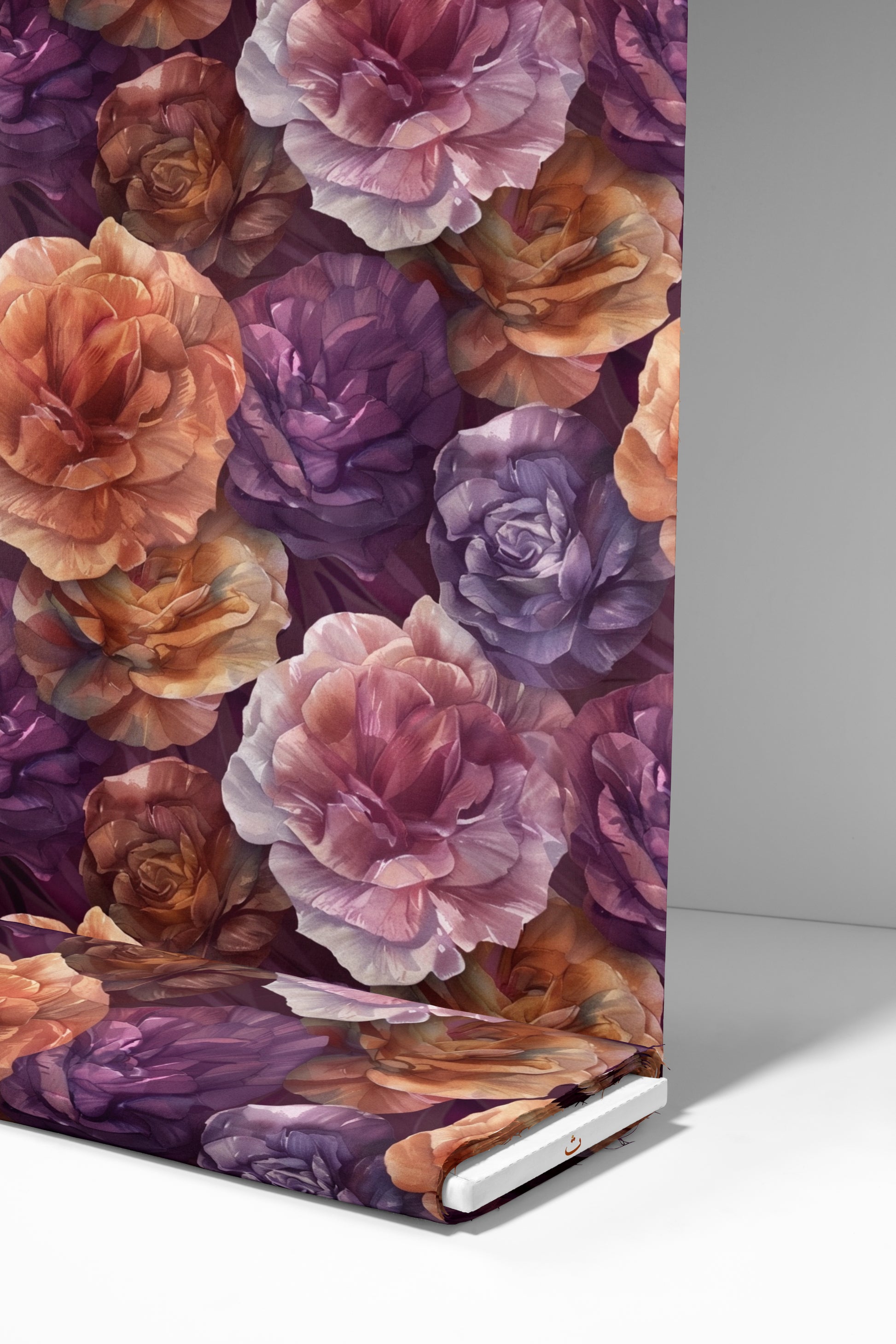 Captivating floral fabric design that evokes the serene beauty of a garden at dusk. Featuring intricately layered roses in shades of plum, lavender, burnt orange, and blush, the pattern blends soft romance with a moody, sophisticated edge.